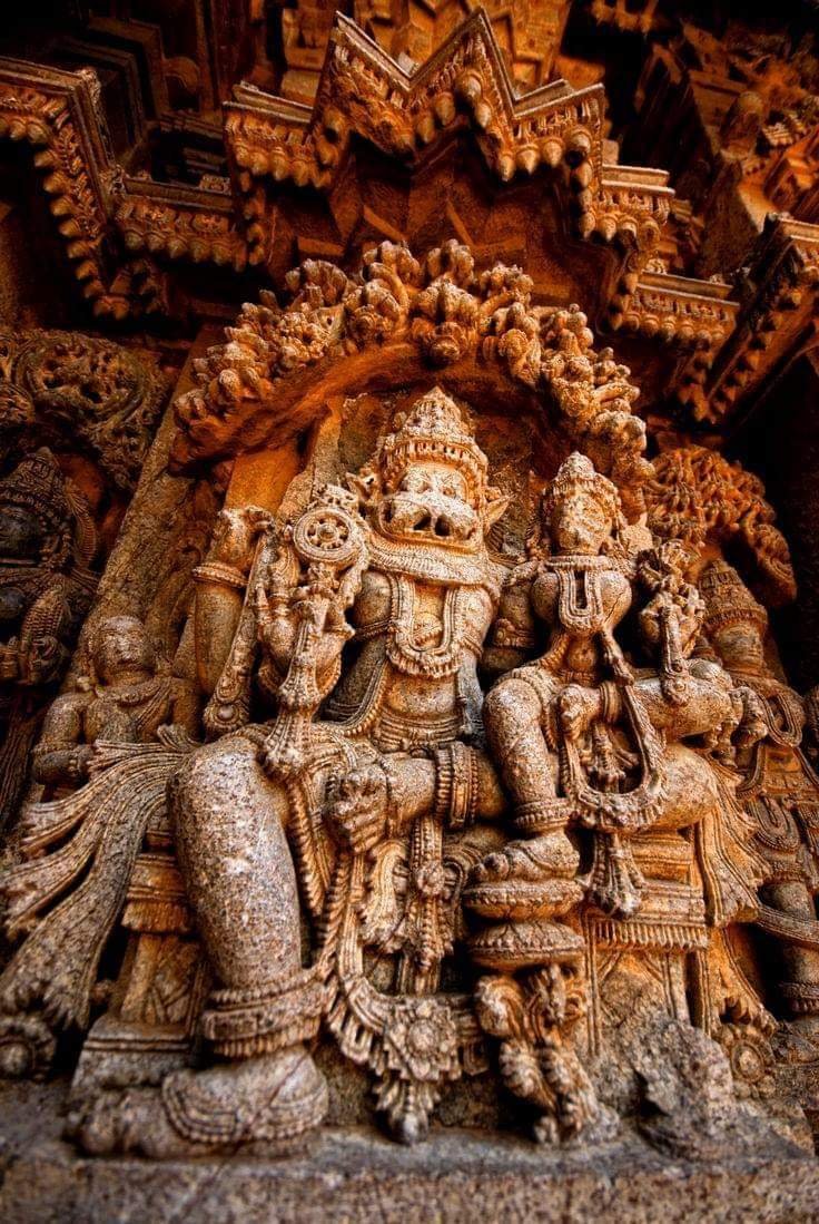 Lakshmi Narasimha – Seen seated on Padmasana or Simhasana with Lakshmi on his left Jangha/Thigh. 🙏Lakshmi Narasimha Carvings on the walls of Chennakesava Temple, Somanathapura, Chenna Keshava Temple at Somanathapura , just 36 km from the historic Mysore city in Mysore district, Karnataka, is an excellent example of the spectacular Hoysala style of architecture. Full of intricate sculptures; beautiful and ornate carvings, pillars, lintels and ceilings, this magnificent work of art is one of the few well preserved Hoysala monuments. Narasimha from Somanathapura Chennakesava Temple .#thehindugodsandgoddesses 💓