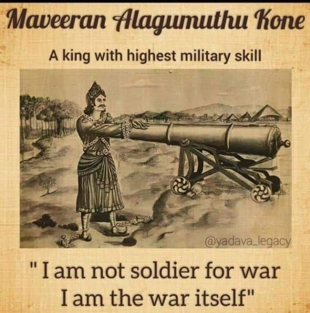 July 11, #Tamilnadu Government declared as birthday of VeeraAlakuMuthuKon (1728 – 18.11.1757) and celebrate state level function.Hidden #History Of India’s 1st Freedom FighterKing VeeraAzhakuMuthuKon(1728 – 18.11.1757)Name : VeeraAzhakuMuthuKonBorn : 1728 Kattalankulam Fort, Kattalankulam, Thirunelveli(present day Thuthukudi) Thamizhnadu,IndiaDied : 18 November, 1757(aged 29) Nadukaatur, ThirunelveliFather : King AzhakuMuthuKon(AzhakuMuthu is their family name)Mother : Rani AzhakuMuthammaalClan : Aayar(Yadavar)Gothram : Krishna GothramFamilyTitles : VaanaraVeerar, Vaanaathirayar, Milaadudaiyar, ServaikaararLife History:VeeraAzhakuMuthuKon is a King of Kattalankulam. Ettayapuram Raja Jegaveeraramapandiya ettappan as a best friend of VeeraAzhakuMuthuKon. Indian history say, first freedom war is 1857 but 100 years before the freedom war was started. First Freedom Fighter King VeeraAzhakuMuthuKon.#King:Father AzhakuMuthuKone became a King of Kattalankulam in the year 1725 and he died in the war of 1750 in Anumandhakudi. So our freedom fighter VeeraAzhakuMuthuKon became of King of kattalankulam in the year 1750 at his age of 22.ChinnaAzhakuMuthuKon:ChinnaAzhakuMuthuKon was born on 1729. He is a younger brother of VeeraAzhakuMuthuKon. He died in the war of 1755April shooted by british general mohamed yusuf khan(KhanSahib or marudhanayakam) in front of PerumalKoyil.#Freedom History: 1.Our freedom fighter VeeraAzhakuMuthuKon fight against british in the place of pethanayakanoor fort 2 .britishers shoot VeeraAzhakuMuthuKon’s horse and his right leg. but VeeraAzhakuMuthuKon continue the war in 3 hours3. finally british general mohamed yusuf khan or KhanSahib(marudhanayakam) (1725 – 15.10.1764) arrested VeeraAzhakuMuthuKon4. britishers cut the right hand of 248 soliders of VeeraAzhakuMuthuKon5. british general mohamed yusuf khan said ” You say sorry to britishgovernment and i release you. but our freedom fighter VeeraAzhakuMuthuKon don’t say sorry to british government6. our freedom fighter VeeraAzhakuMuthuKon and his 6 Konar(Yadav) generals locked in the iron chain in the front of cannon and shooted by british general7. they are died in the place of Nadukaatur, Thirunelveli districtOur Freedom Fighter’s Generals names are following:1. KetchilananKonar2. MuthuAlaguKonar3. VenkateswaraEttuKonar4. JegaveeraRettuKonar5. MuthuIrulanKonar6. MayilupillaiKonarYadavas are called ‘Konar’ in ThamilnaduPC Rajesh Kanna -Madurai K.Rajeshkanna#NationFirst #Bharat