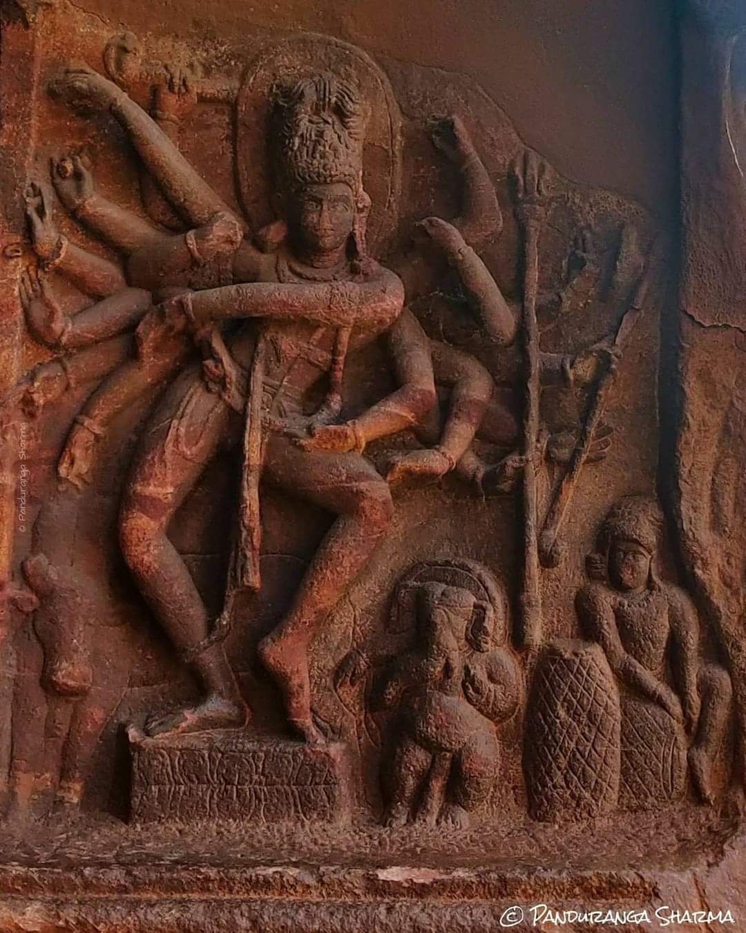 Shiva performing Tandava (Badami Caves)Karnataka 💓Tandava Murthi is carved onto the cliff face on the right side of Cave 1.Shiva is shown with 18 arms (9 on each side), few holding astras, few holding musical instruments and few bare handed – combination of them depict specific karanas from the natyashastra.This murthi is categorised as “madhyama” with only partial ganas including Ganesha and Tandu (Drummer) are shown in the panel. His vehicle Nandi is standing behind him. His Jatamakuta is mesmerising and the katisutra acting as plumb line.Shiva is standing with an elegant dancing pose on a lotus flower pedestal. His right leg in parshva posture, left leg in suchi posture and the right part of the waist is lifted to depict the udvahita kati. Combined, these give a magnificent tribhanga posture to the overall murthi.Shiva instructed Tandu, One if his attendants to teach this dance to Sage Bharata (author of Natya Sastra). Hence this dance took the name “Tandava”. Combining one hand from either side of Shiva, one can see 81 distinctive poses of Bharanatyam.With 4 arms on each side, Shiva here is performing a total of 9 karanas. They are -Apaviddha (4)Nikuttakam (9)Mattalli (27)Ardhamattalli (28)Recitanikuttakam (29)Valitam (31)Bhujangatrastarecitam (35)Aksiptam (55)Sarpitam (81)📷 By @pandurangasharmab1902 sir (Instagram)#TeamlostTemples