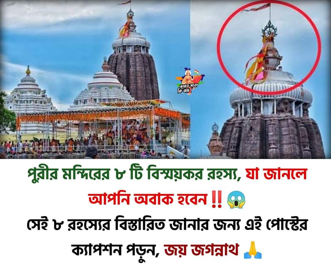 পুরীর জগন্নাথ ধামের ৮টি ভয়ঙ্কর রহস্য, যা আজও অমীমাংসিত…!!জগন্নাথদেবের রথযাত্রা হলো আমাদের হিন্দু সনাতন ধর্মের অতি প্রসিদ্ধ এবং জনপ্রিয় একটি উৎসব। পুরীতে এই উৎসব বিশেষভাবে অনুষ্ঠিত হয়। বহু দূরদূরান্ত থেকে মানুষ পূণ্য অর্জনের পাশাপাশি নিজস্ব মনস্কামনা পূরণের জন্য রথযাত্রার দিন পুরীতে আসেন। শাস্ত্রে বলা হয় যে, রথের উপর অবস্থানরত অবস্থায় জগন্নাথদেবকে দেখলে তার আর পুনর্জন্ম হয় না। তাই জন্ম-জন্মান্তরের এই চক্র থেকে উদ্ধারের জন্যই রথ যাত্রার মত উৎসবে এত বিপুলসংখ্যক মানুষের জনসমাগম হয়।জগন্নাথধাম পুরীর রথযাত্রা যেমন মানুষকে আকর্ষিত করে তেমনি পুরীর মধ্যে কতগুলি রহস্য আছে, যা যুগ যুগ ধরে মানুষকে আকর্ষিত করে চলেছে। এমন কতগুলি অমীমাংসিত রহস্য পুরী ও জগন্নাথ মন্দিরকে ঘিরে রয়েছে, যার আজ অবধি কোনও বৈজ্ঞানিক ব্যাখ্যা পাওয়া যায় নি। পুরী ও পুরীর জগন্নাথ মন্দিরকে কেন্দ্র করে আবর্তিত হওয়া চির রহস্যাবৃত, সেই আটটি ঘটনা কী কী চলুন জেনে নিই….।১. পুরীর মন্দিরের মাথার উপর যে পতাকা রয়েছে সেই পতাকাটি সব সময় হাওয়ার বিপরীত দিকে উড়ে। কী কারনে এমনটা হয়, তার ব্যাখ্যা বৈজ্ঞানিকরাও পাননি।২. পুরীর মন্দিরের উপরে ২০ কেজি ওজনের একটি সুদর্শন চক্র রয়েছে। যেটি পুরী শহরের যে কোন জায়গা থেকেই দেখা যায়। এত আড়াল আবডাল সত্ত্বেও কীভাবে পুরীর যে কোন জায়গা থেকেই সেটি দেখা যায়,তা নিয়েও গভীর রহস্য রয়েছে?৩. জগন্নাথ মন্দিরের মোট চারটি দরজার মধ্যে অন্যতম হলো সিংহদ্বার। দর্শনার্থীরা সিংহদ্বারের আগে অবধি সমুদ্রের হাওয়ার শব্দ শুনতে পান। কিন্তু যখনই তারা সিংহদ্বার পেরিয়ে মন্দিরে প্রবেশ করেন তখন আর তারা কোন শব্দ শুনতে পান না।৪. পুরী মন্দিরের উপর দিয়ে কোন পাখিকে আজ অবধি উড়তে দেখা যায় নি! এমনকি এই মন্দিরের উপর দিয়ে বিমান পর্যন্ত যায় না! কেন কী রহস্য এর পেছনে তা জানা যায়নি। তবে ভক্তরা মনে করেন জগতের নাথ যিনি তার উপর দিয়ে কারোর যাওয়া সম্ভব নয়, তাই এমনটা ঘটে।৫. পুরীর জগন্নাথ মন্দিরের ছায়া দিনের কোন সময়ই মাটিতে পড়ে না। এই নিয়ে যুগ যুগ ধরে চলছে নানা তর্ক-বিতর্ক, তবে সে তর্ক বিতর্কের অবসান আজও হয়নি!৬. বিশ্বের যে কোন জায়গায় সকালবেলায় সমুদ্র থেকে তীরের দিকে হাওয়া আসে। আর বিকেলবেলা উপকূল থেকে সমুদ্রের দিকে হওয়া যায় কিন্তু পুরীর সমুদ্রের ক্ষেত্রে ঠিক তার উল্টো নিয়মটা ঘটে। এই ঘটনা সত্যিই এক বিস্ময়!৭. পুরীর আরও এক রহস্য হলো, এই মন্দিরের পাকশালা। এই মন্দিরের প্রসাদ কখনোই নষ্ট হয় না! রেকর্ড অনুযায়ী, প্রতিদিন যত সংখ্যক পুণ্যার্থী আসুক না কেন, সকলেরই প্রসাদ খেয়ে যান এখানে। পুণ্যার্থীর সংখ্যা ২ হাজার হোক অথবা ২০ হাজার, প্রসাদ কখনো শেষ হয়ে যায় নি! কখনো এক ফোঁ