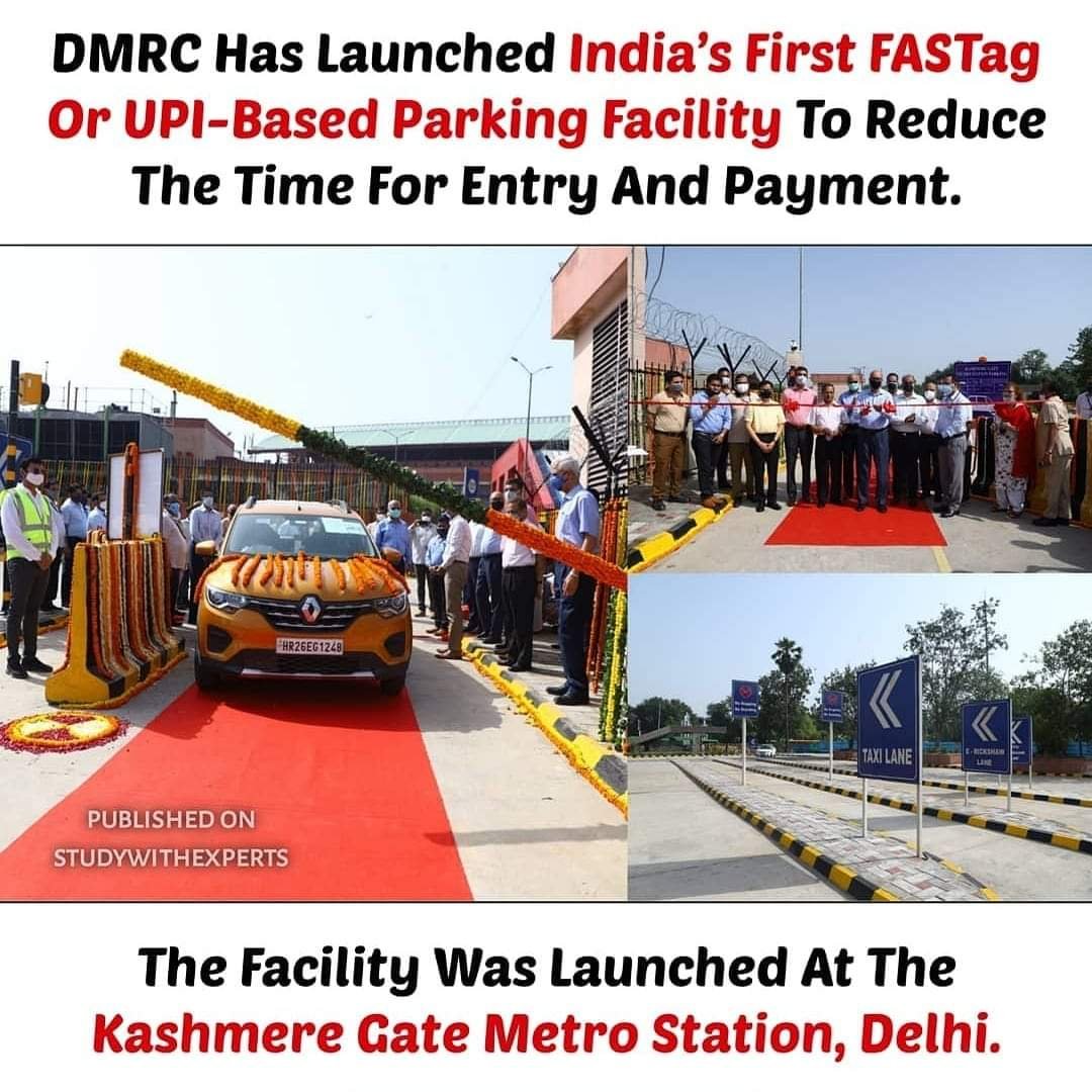 Delhi Metro Rail Corporation (DMRC) has launched India’s first FASTag or Unified Payments Interface (UPI)-based parking facility to reduce the time for entry and payment. The facility was launched at the Kashmere Gate metro station. As part of the Multi-Model Integration (MMI) initiative, dedicated Intermediate Public Transport (IPT) lanes for autos, taxis and r-Rickshaws were also inaugurated at the station.Facilities provided:• The facility can accommodate 55 four-wheelers and 174 two-wheelers. The entry and exit and payment of 4-wheelers can be done through the FASTag.• The parking fee will be deducted through FASTag, which will reduce the time for entry and payment. Only the vehicles with FASTag will be allowed to park in this facility.• The entry for 2-wheelers can be done only by swiping the DMRC smart card.• The smart card swipe is used only for registering the time of entry and exit and fare calculation and no money will be deducted from the card.•The parking fee can be paid via UPI apps by scanning the QR Code.Reposted from @studywithexperts