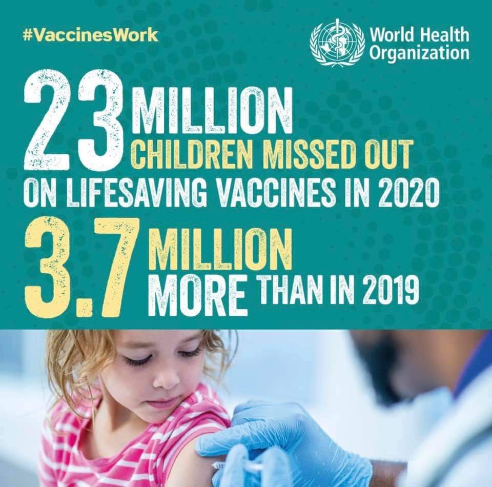 due to the covid-19 pandemic, 2⃣3⃣ million children 👦👧 missed out on basic vaccines through routine immunization services in 2020, increasing by 3.7 million and the highest number since 2009. .. thanks isr